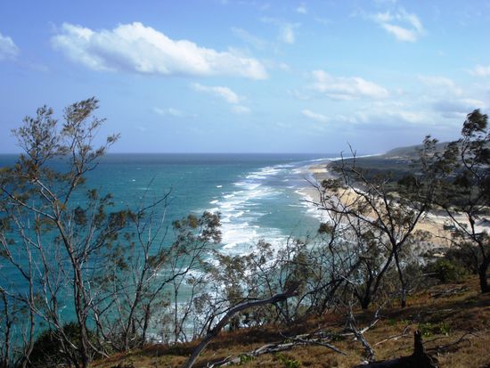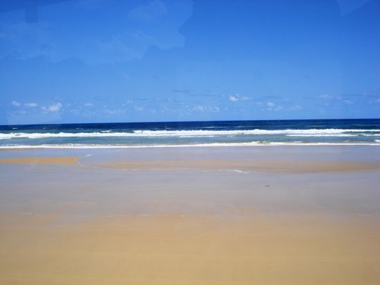 Nach dem Mittagessen wurde die Fahrt ein bisschen weniger holprig. Als "Strasse" in Richtung Norden benutzte Graham nicht die verschlungenen Sandpisten im Innern der Insel sondern fuhr auf dem "Highway". Also eigentlich fuhren wir auf dem "75 Mile Beach", dem Strand an der Ostkueste der Insel. Dabei handelt es sich wirklich um einen offiziellen Highway mit 80km/h Maximalgeschwindigkeit und Linksverkehr. Der Highway ist gar nicht so wenig befahren wie man meinen koennte. Viele Australier und auch Touristen verschiffen von Hervey Bay oder Rainbow Beach aus ihren privaten 4WD auf die Insel um in den Seen zu baden oder an den Straenden zu fischen.