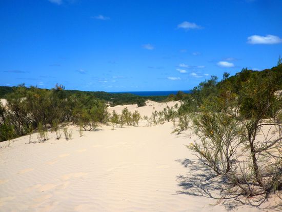 Fraser Island ist die groesste Sandinsel der Welt, selbst der Regenwald waechst auf Sand. Aus diesem Grund ist es auch nicht moeglich mit einem "normalen" Auto Fraser Island zu erkunden. Fuer die sandigen Strassen braucht man zwingend einen 4WD. Deshalb liessen wir unseren Toyota fuer 2 Tage in Hervey Bay (in einem Motel, das wir gar nicht ungern fuer eine Nacht verlassen haben) und schlossen uns einer Tour an.