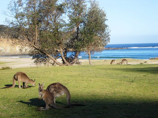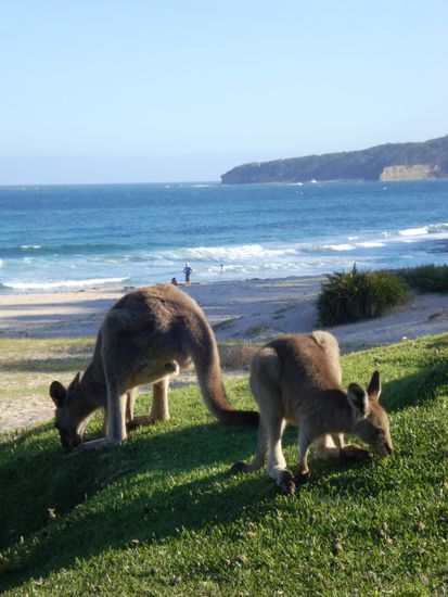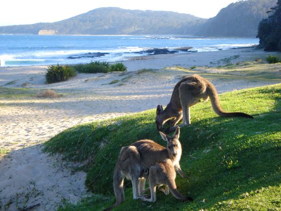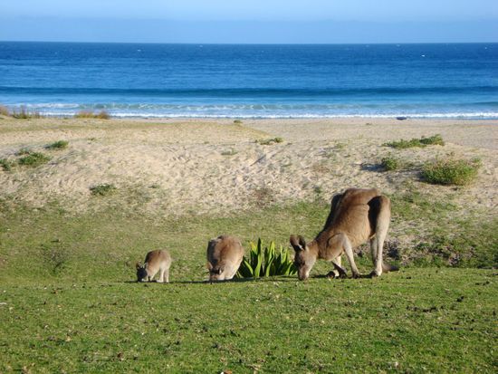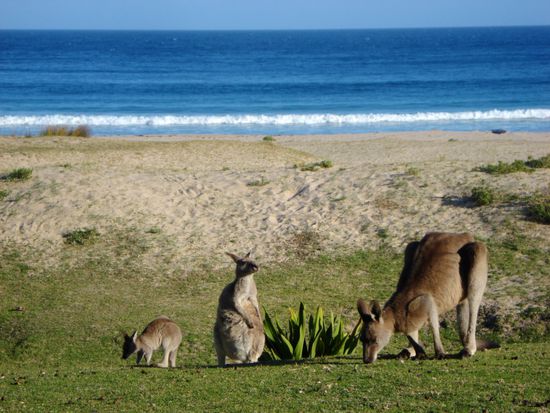Am spaeteren Nachmittag erreichten wir ueber eine ziemlich holprige und loechrige Piste Pebbly Beach suedlich von Ulladulla. Dort sollen scheinbar regelmaessig Kangaroos am Abend grasen oder sich im Meerwasser erfrischen. Tatsaechlich wurden wir nicht enttaeuscht! Auch Papageien waren viele zu sehen und auf dem Rueckweg kreuzte eine ziemlich gefaehrlich aussehende, schwarze Schlange unseren Weg..