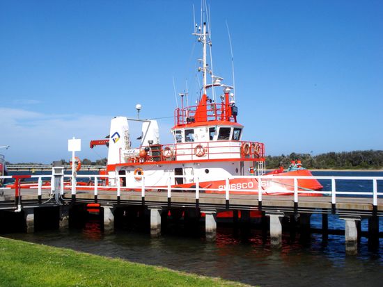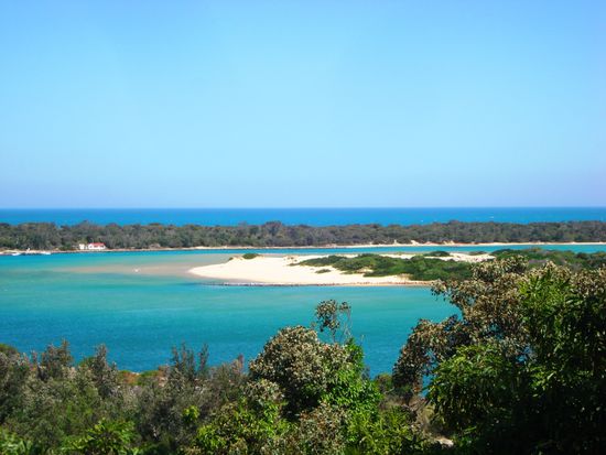 Gegen Abend trafen wir in Lakes Entrance ein. Von Norden oder Westen her anreisend faehrt man auf dem Princes Highway an einigen schoenen Aussichtspunkten vorbei, wo man auf die Lagunen herabblickt, die bei Lakes Entrance durch eine schmale Oeffnung mit dem Tasmanischen Meer verbunden sind.