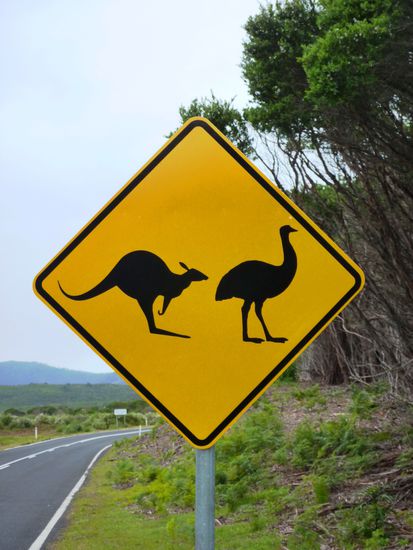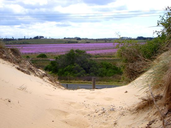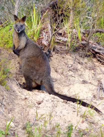 Am naechsten Tag wollten wir auf dem Weg in die Naehe des Wilsons Promontory National Park (The Prom) bei Loch Sport im Lakes Nationa Park noch graue Kangaroos am Strand beobachten. Die Strasse durch den Nationalpark war aber wieder mal ungeteert und in unserem Kia recht holprig. Erst hatten wir es versucht, aber 10 Kilometer koennen auf diese Weise (wir konnten durchschnittlich etwa 20 km/h fahren) recht lang werden. Ausserdem hiess es nach etwa einem Viertel des Weges sowieso, dass die Strasse nur noch mit einem 4WD befahren werden kann. Das koennte man auch frueher sagen! All zu gross war die Entaeuschung jedoch nicht, dass wir wieder umkeheren mussten. Es hatte uns sowieso zu viele Moskitos. Auf dem Rueckweg sahen wir dann das graue Kangaroo trotzdem noch. Es stand mitten auf der Landstrasse! Wir waren wohl beide etwas verbluefft , so hoppelte es dann doch recht schnell davon. Fuer ein Foto reichte es leider nicht.