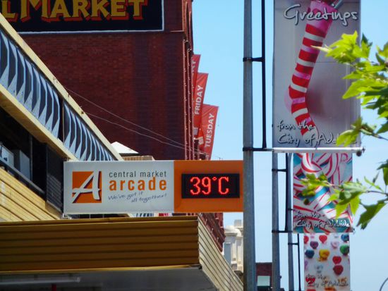 Fuer die letzten zwei Naechte vor unserem Weiterflug nach Perth und Louises Heimflug, haben wir dann doch noch ein Zimmer in der Innenstadt ergattert. Ein Glueck, dass es sauber und angenehm war, denn wir verbrachten unerwartet viel Zeit darin . Es wurde wieder heisser und bei etwa 34 Grad wurde uns beim herumlaufen schnell heiss. Irgendwie konnte uns die City von Adelaide auch nicht wirlkich begeistern, da hatten wir schon viel schoenere und interessantere Staedte in Australien gesehen. Muede vom Reisen und fluechtend von der Hitze machten wir es uns deshalb im Hotelzimmer gemuetlich und genossen die letzten Stunden mit Harry Potter . Am kommenden Tag war ein erneuter Temperaturrekord gemeldet (43 Grad, der heisseste Novembertag in Adelaide seit Beginn der Aufzeichnungen vor etwa 100 Jahren). So machten wir uns auch an diesem Tag aus dem Staub, als das Termometer gegen 40 Grad anstieg..