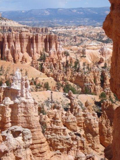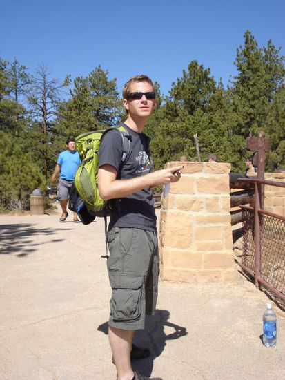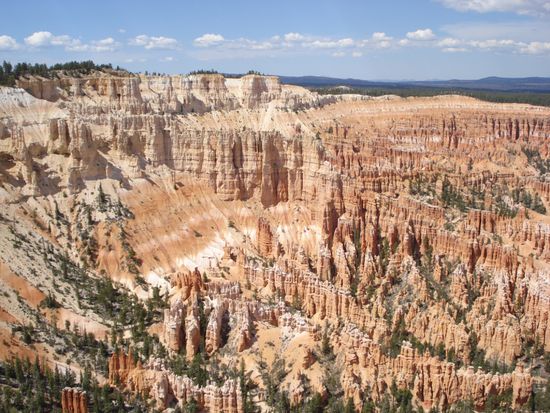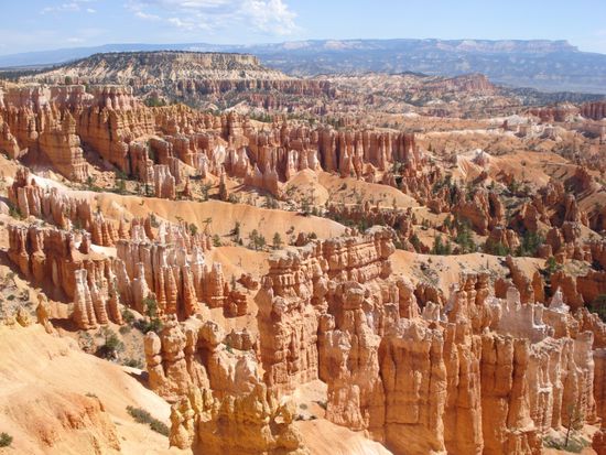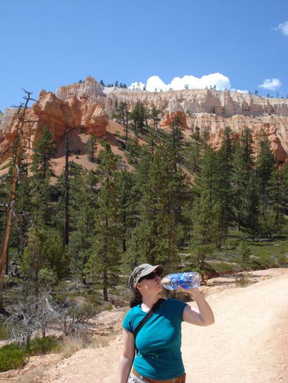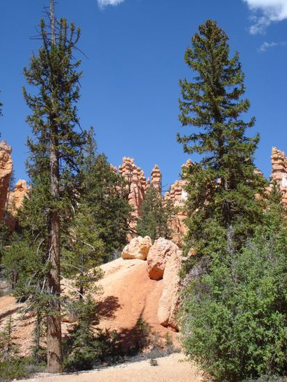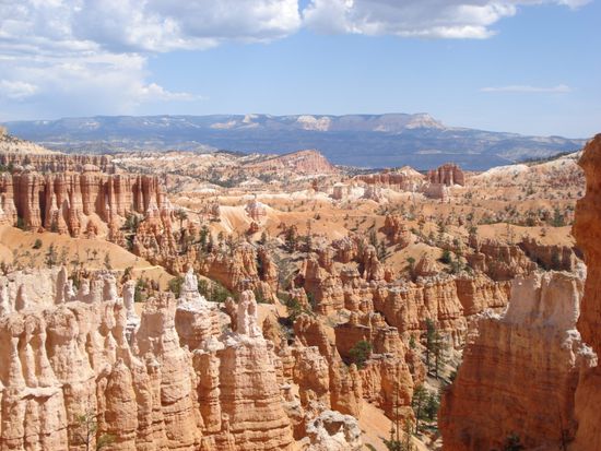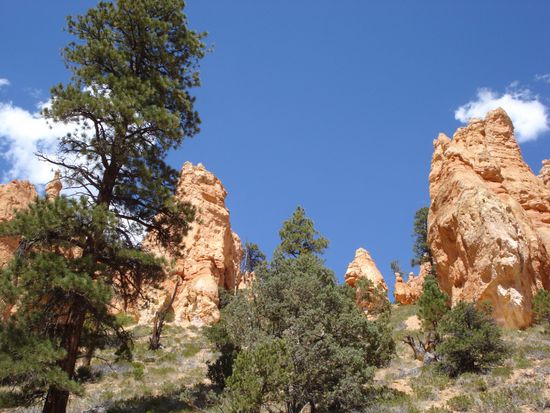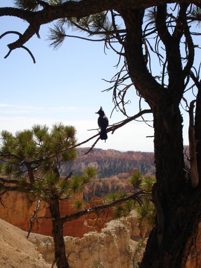Am naechsten Morgen besuchten wir also den Bryce Canyon. Das Wetter war wieder einmal perfekt und wir entschieden uns fuer einen ca. 2 stuendigen "Navajo Loop Trail". Dabei steigt man vom Sunset Point aus in den Canyon hinab und wandert zwischen Nadelbaeumen, orangen und weissen Steintuermen und Naturskulpuren hindurch bevor es an einer anderen Stelle den Canyon wieder hinauf geht. Das war wirklich sehr schoen und jedem nur zu empfehlen! Nach diesem kurzen Hike fuhren wir mit dem Auto noch weiter in den Nationalpark zum hoechsten Punkt des Bryce Canyon National Parks welcher auf sage und schreibe 2778m ueber Meer liegt! Auch wenn wir kaum merkten, dass wir schon bei der Anreise von Las Vegas zum Grand Canyon (auf 2100m) etliche Hoehenmeter zuruecklegten, welche wir auf dem Weg zum Bryce Canyon erst wieder verloren um dann noch hoeher zu steigen, spuerten wir die Hoehe an dieser Stelle doch ganz klar. Wir hatten beide ziemliche Kopfschmerzen und uns war etwas schwindlig. Dafuer posierte ein Squirrel wieder extra nur fuer uns.