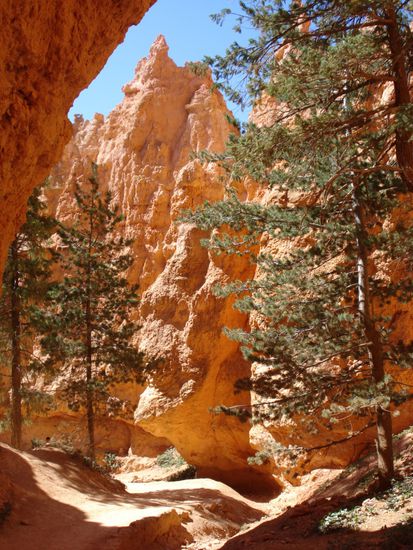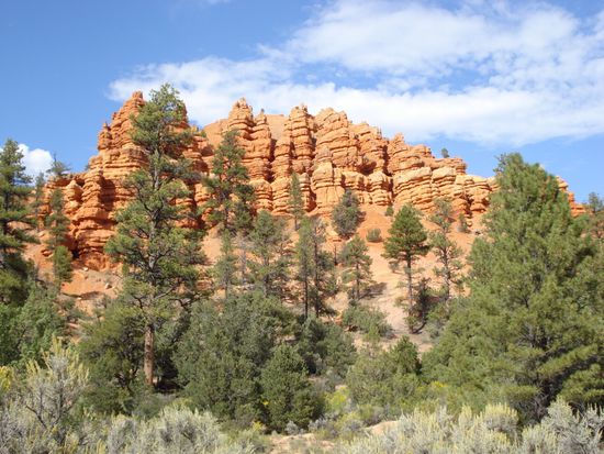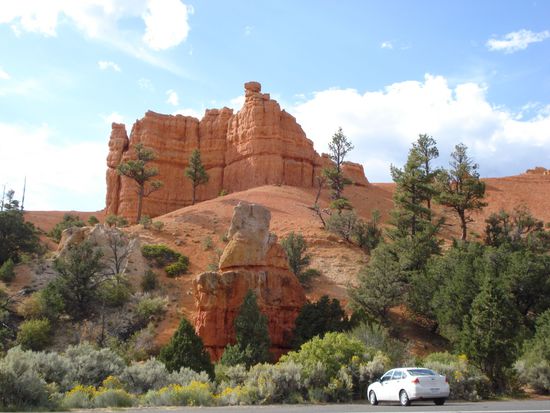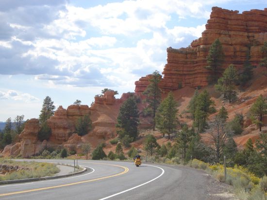 Das letzte Stueck unserer Tagesetappe fuhren wir durch den Red Canyon. Dieser liegt direkt am Highway 12, welcher zum Bryce Canyon fuehrt. Der Red Canyon war also nicht zu verfehlen und lag sowieso auf dem Weg. Wir waren uns beide einig, dass diese Strecke durch die roten Steinschluchten eine der schoensten war welche wir erlebt haben. Nur das Wetter wurde wieder etwas schlechter und es zogen Woklen auf. Wir wussten aber, dass wir am folgenden Tag, auf dem Weg zurueck zum Zion National Park, sowieso nochmals den Highway zurueck fuhren und dann womoeglich den Canyon noch in der Sonne erleben wuerden. Dies war dann auch so und die Fotos die ihr seht sind eigentlich vom naechsten Tag. Wir uebernachteten also in Tropic in einem wirklich "herzigen" Motel, dem Bryce Canyon Inn. Dazu gehoert auch "the pizza place" von welchem wir schon im Internet gelesen haben. Die Pizzas waren wirklich nicht schlecht, wenn auch doch etwas amerikanischer als italienisch .