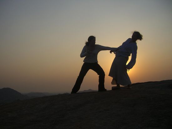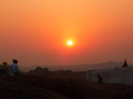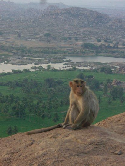Gestern hatten wir mit unserem Seetuktukchauffeur ausgemacht, dass er uns um 5.00 in der Frueh abholt und uns zum 5km entfernten Monkeytempel bringt, damit wir dort den Sonnenaufgang anschauen koennen. Wir quaelen uns also aus unserem Riesenbett und taumeln im Stockdunkeln, nur von Calles Taschenlampe gefuehrt auf die Strasse. Nur zwei bange Minuten spaeter kommt der Junge tatsaechlich angerast, unterstuetzt von einem Freund, der sich mit ihm auf den Fahrersitz quetscht und los gehts. Nur wenig spaeter kommt das TukTuk am Fusse des Monkeyberges, den wir gleich auf mehreren 500 Stufen besteigen werden, mit quietschenden reifen direkt vor zwei auf der Strasse schlafenden Menschen zum Stehen, aber wirklich haarscharf...und wir stolpern auf die dunkle Strasse. Eine Frau, die dort ihren Stand hat und die wahrscheinlich immer mit den ersten Tempelbergbesteigern aufwacht moechte uns Chai verkaufen und deutet auf zwei Plastikstuehle mitten in ihrer Freiluftkueche. Da sagen wir nicht nein und beobachten sie dabei wie sie mit unendlicher Ruhe einen superfrischen Chai ueber dem offenen Feuer aufbrueht. Wir werden natuerlich nervoes, weil wir auf keinen Fall den Sonnenaufgang verpassen wollen. Als sie endlich fertig ist, drueckt sie uns die Glaeser in die Hand und sagt, wir solen sie mit hoch nehmen. Wir klettern los und schon faengt auf dem Tempelberg ca 300m ueber uns eine seltsame Meditationmusik an zu scheppern. Oben angekommen ist es schon fast hell, aber die Sonne ist noch nicht aufgegangen. Es ist auch nicht ganz einsam dort oben, es leben noch ein wildes Affenrudel und ein paar halbnackte Gurus da, die gerade ihre Morgenwaesche machen. Die blecherne Musik schallert immer weiter und die Gurus lassen sich von uns auch nicht im geringsten aus der Ruhe bringen, also ziehen wir unsere Schuhe aus und erklimmen die Felsen, die sich noch weit ueber den Gipfel erstrecken. Wir erleben einen absolut berauschenden Sonnenaufgang mit einem Wahnsinnsblick ueber das ganze Hampital.