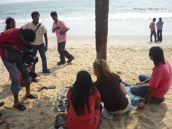 "sdjflsdfjsf, just for you!" sprach sie engagiert in die Kamera, waehrend sich die beiden schicken ModeratorInnen gutgelaunt an ihre Seite schmiegten. Sie waren schnell zufrieden und zogen weiter. So schaffte Osi dann tatsaechlich noch den Sprung zumindest schonmal ins indische Fernsehen und folgte damit der ihr verkuendeten Bestimmung. Ihre Strandfrisur und ihr schwitziges Sonnencremegesichts liessen sie jedoch an ihren Qualitaeten als neues Fernsehsternchen Indiens zweifeln.