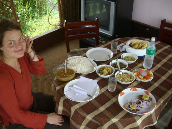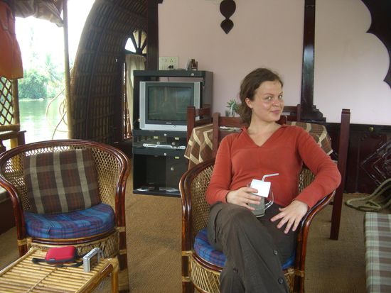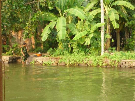 Die Natur und die Doerfchen sind schoen, aber etwas eintoenig auf die Dauer. Aber der Luxus, das Wahnsinnsschiff und die netten, zur Abwechslung mal sehr dezenten Maennlein machten das mehr als wett. In Kerala sind die Leute grundsaetzlich sehr froehlich und lachen immer zurueck oder winken, wenn man sie anlacht.