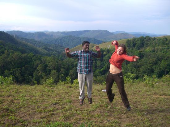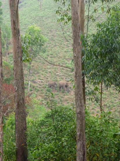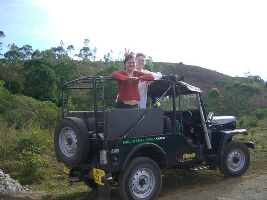 In Kottayam, von wo aus wir den Bus(4,5 Std) ins Periyar nehmen wollten quatschte uns ein Tuktukfahrer ein Taxi auf, also schlaengelten wir uns nur 3Std und ein bisschen bequemer, aber teuerer ins Gebirge. Im Coffee Inn Cottage in Kumili eingecheckt, buchten wir sofort eine Ganztagesjeepsafari in den GEOEFFNETEN Nationalpark am naechsten Tag. Wir wohnten in einer Huette direkt vor dem Eingang des Parks, wo naechtens wilde Tiere herumstreiften.