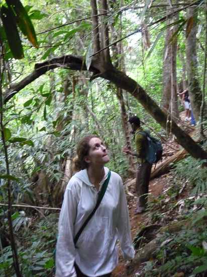Wir brachen zu einem 3-stuendigen Trekking auf und da sich alle Gruppen in dieselbe Richtung bewegten, wurden wir ein bisschen unleidig, weil das alles gar so massenabfertigungsmaessig war. Aber irgendwann verteilten sich die Parteien und wir streiften tatsaechlich durch verschlungene Dschungelpfade, hoerten seltsame Geraeusche, bekamen die tollsten Pflanzen und Baeume gezeigt (Zimtbaum, Pfefferstrauch, Weihrauchbaum...) und kamen doch voll auf unsere Kosten.
