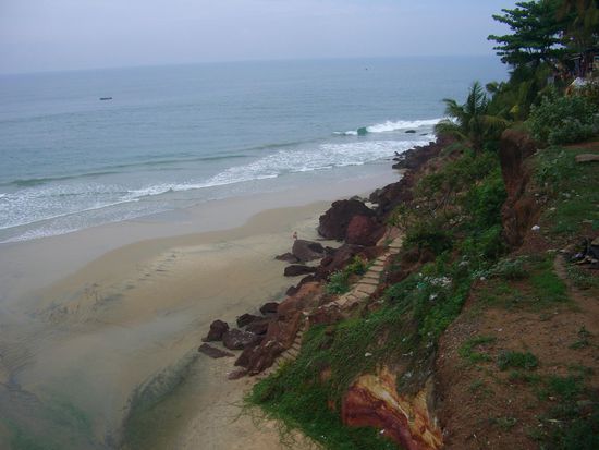 Die Klippen von Varkala waren mit Hostels, Restaurants und Laeden zu einem gemuetlichen Ferienoertchen gestaltet worden. An den Klippen entlang erstreckt sich ein makelloser Sandstrand, der ueber Treppchen zu erreichen ist.