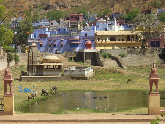 Halbwegs erholt streiften wir ein bisschen in dem wirklich wunderschoenen, geschichtstraechtigen, unglaublich orientalisch daherkommenden Bundi herum. In einem Talkessel an einem heiligen See (momentan eher Schlammpfuetze) gelegen,