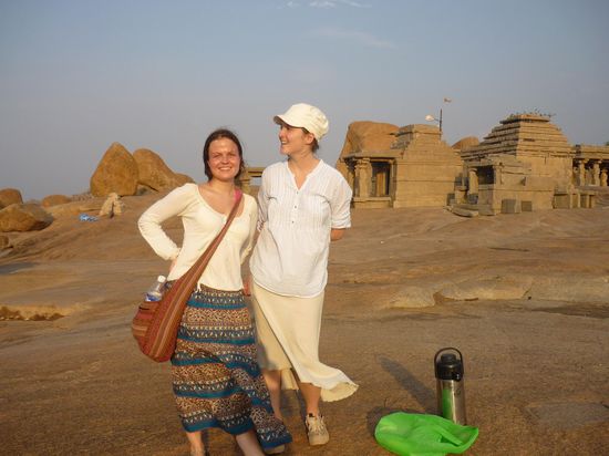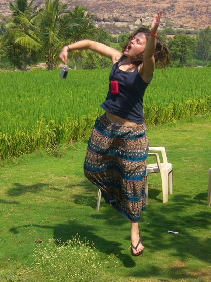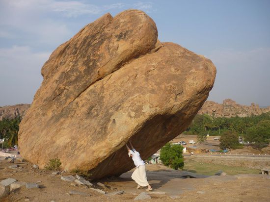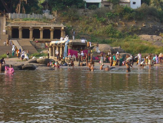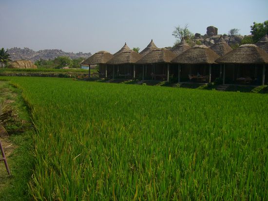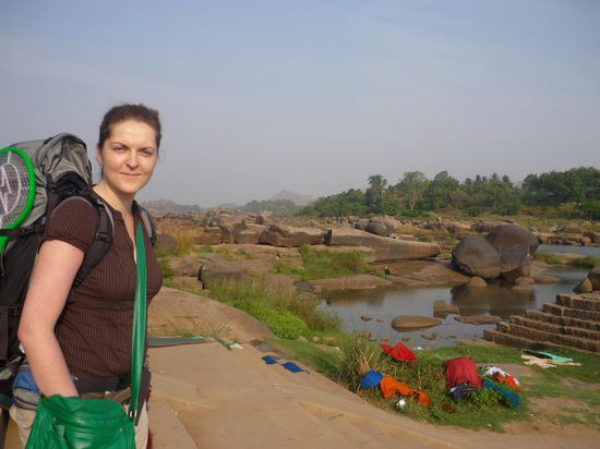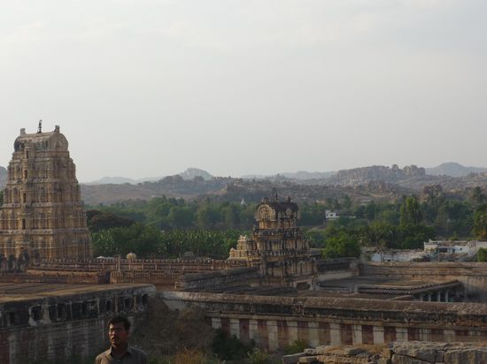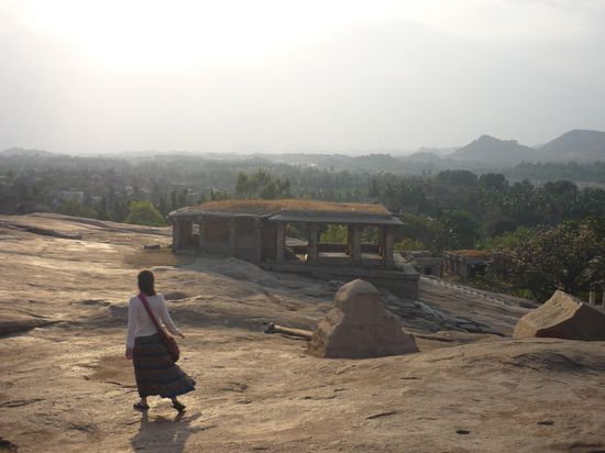 Hampi ist ein seltsamer Ort inmitten eines verfallenen Hindu- Koenigreichs aus dem 15 Jahrhundert. Die Landschaft ist verzaubert. Um den Fluss herum befinden sich unglaublich gruene Grasflaechen, Reis und Zuckerfelder, Bananenplantagen und Palmen ohne Ende. Die Flussau umrahmen Huegel, teilweise sogar kleine Berge, die vollkommen aus runden, aufgetuermten Steinen in den abstraktesten Formationen bestehen. Die Ruinen des Koenigreiches sind weitlaeufig in die Landschaft gestreut.