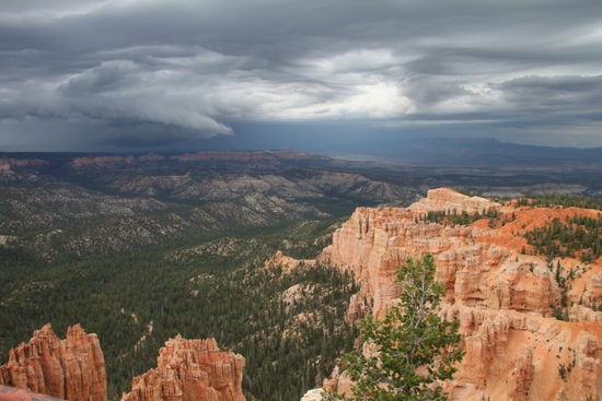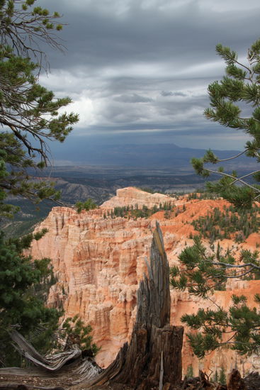 Die Fahrt führt uns dann weiter Richtung Bryce Canyon. Irgendwie wird das Wetter hier aber immer schlechter. Zumindest sind am Himmel ziemlich viele Wolken. Als wir am Red Canyon ankommen, der kurz vor dem Bryce Canyon ist, steigen wir noch einmal für ein paar Fotos aus und da fängt es doch tatsächlich an zu tröppeln! Nun ja, nachdem wir am Bryce Canyon angekommen sind, checken wir erst einmal in der Bryce View Lodge ein. Das dauert etwas, weil die Computer ausgefallen sind. Nicht schlimm, denn das Wetter ist ja eh nicht berauschend. Unser Zimmer sah aus wie damals: Älteres Mobiliar, etwas muffig, aber trotzdem sauber. Die Sachen werden nur abgestellt und dann geht es direkt in den Bryce Canyon. Das Wetter ist immer noch stark bewölkt und es sieht nicht danach aus, als würden sich die Wolken verziehen, was uns schon ein bisschen traurig macht, denn ich hatte auf einen Sonnenuntergang im Bryce Canyon gehofft. Bis zum Schluss habe ich darauf gehofft, aber leider wurde es immer nur noch bewölkter und es zogen Gewitter auf. Schade! Vor allem weiß man ja auch nicht, wie das Wetter am nächsten Morgen wird, bevor wir zur nächsten Etappe aufbrechen. Trotz des blöden Wetters war es wieder sehr schön im Bryce Canyon und der Anblick in Bezug auf den Canyon und das Wetter hatte schon was, muss ich sagen.