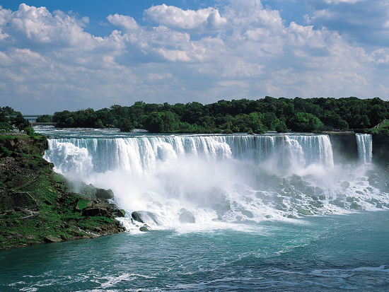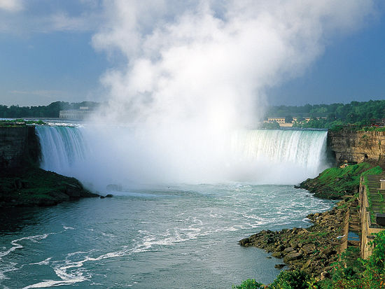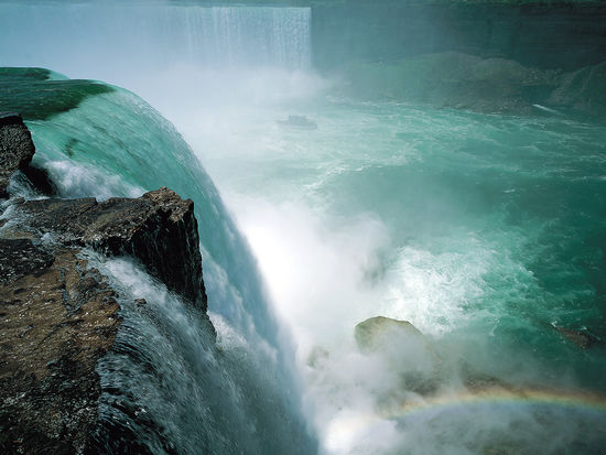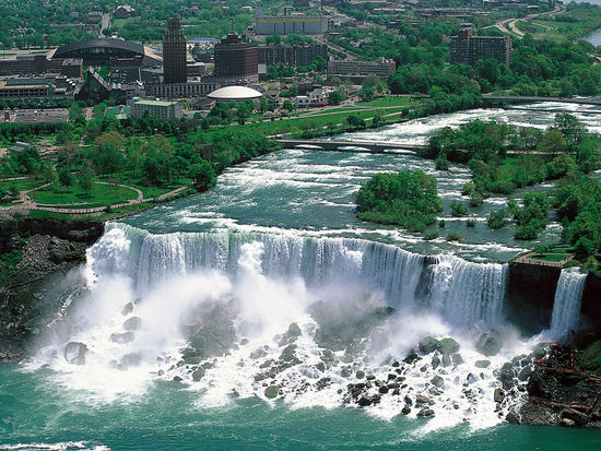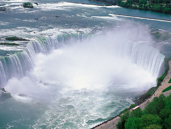 Zunächst sah es nicht so aus. Also machten wir unsere ersten Fotos eben im Regen. Die Niagarafälle bestehen aus den American Falls, die eine Kantenlänge von 363m haben und 21m in die Tiefe stürzen und den kanadischen Horseshoe Falls mit einer Kantenlänge von 792m und einer Fallhöhe von 52m.