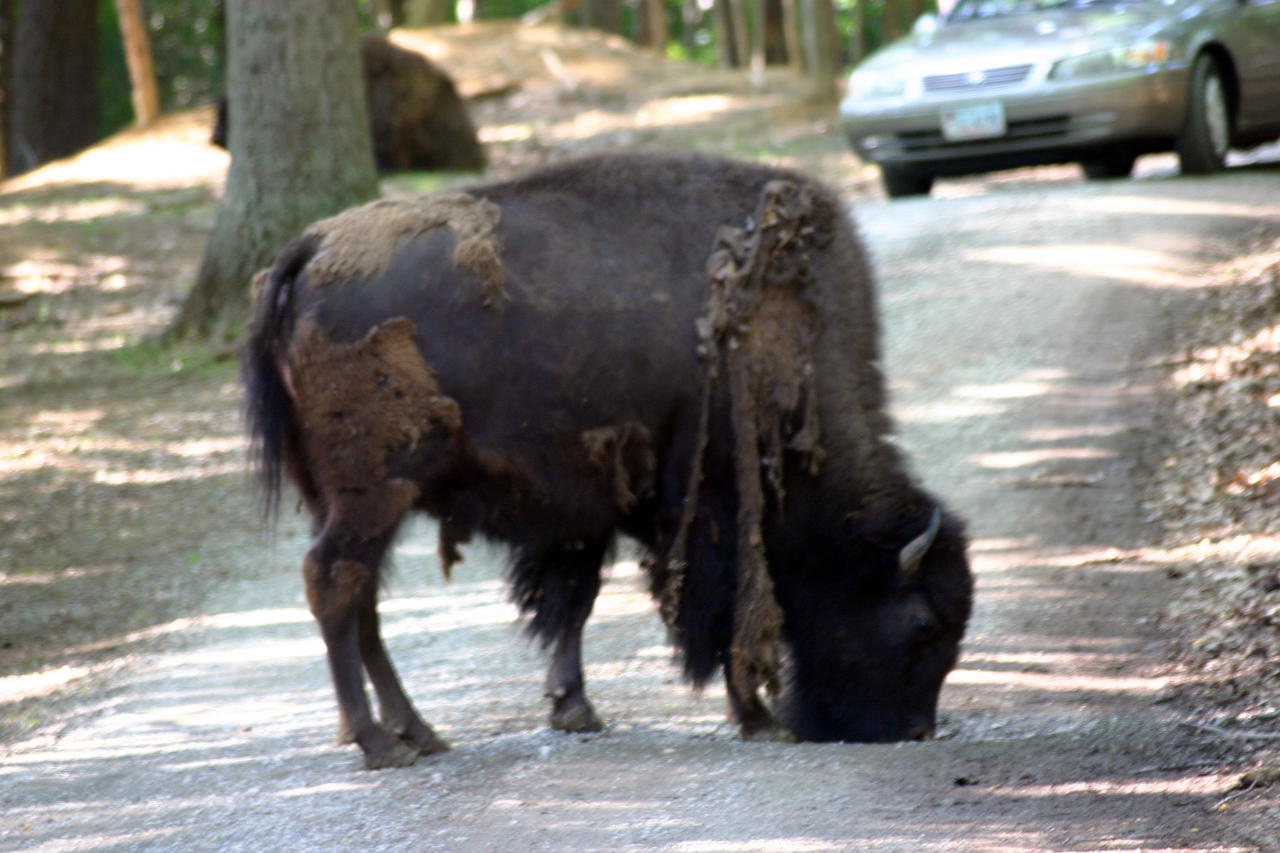 An diesem Bisonbullen kamen wir noch vorbei bevor er eine Straßensperre errichtete. Die Ochmoneks hinter uns hatten da weniger Glück. Ihnen verpasste er nach einer kurzen Inspektion des Wagens ein aerodynamisches Feintuning, indem er kurzerhand ihren rechten Außenspiegel entfernte.