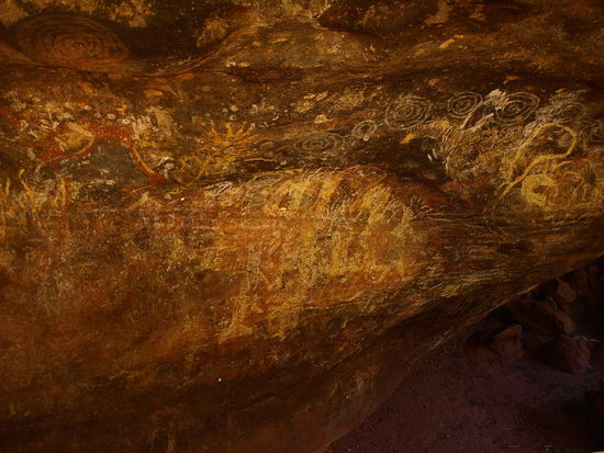 Tags darauf wanderten wir rund um den Felsen und erkundeten die vielen Hoehlen und Felsmalereien der Aboriginies.