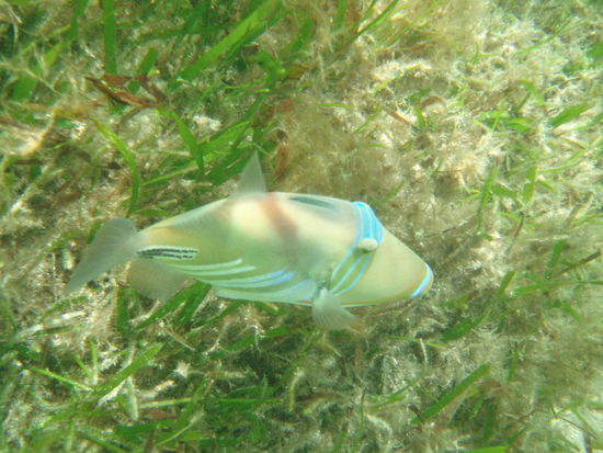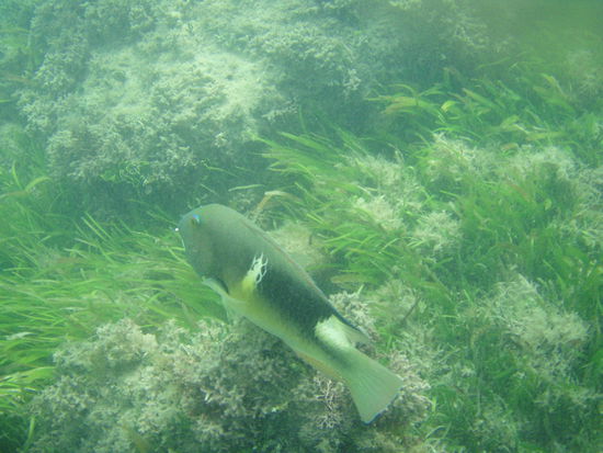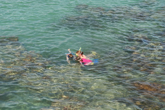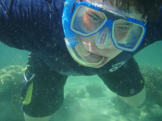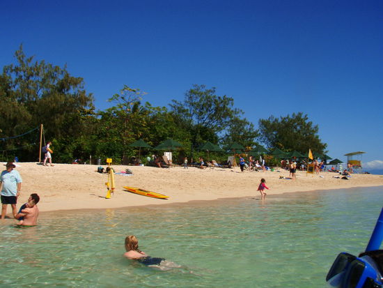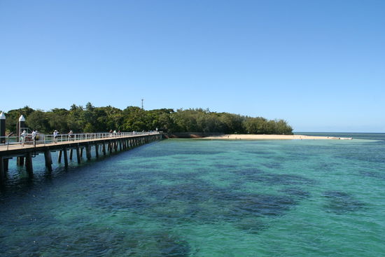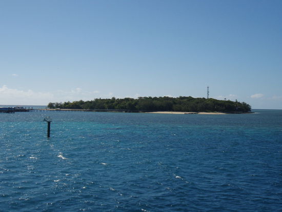 Früh Morgens ist´s zwar noch etwas frisch, aber wir setzen uns unter Deck. Auf der Fahrt wird mir etwas schlecht, es ist schon ganz schön schauklig Aber wir sind ja bald da. Schon von der Weite schaut Green island phantastisch aus, die Sonne scheint, das Wasser ist kristallklar und man kann vom Steg aus die Korallen und Fische gut sehen. Nichts wie hinein!! Der 1. Schnorchelversuch scheitert, dauernd rinnt mir Wasser in den Mund und ich komme wieder aus dem Wasser. Grantig will ich mich schon auf den Rückweg zum Schiff machen um den Schnorchel umzutauschen bis Patrick auf das Problem draufkommt: ich habe den ganzen Schnorchel in den Mund genommen!! Ups, wie peinlich... So, jetzt probier ichs nochmal, und siehe da, es klappt hervorragend. Die Sicht ist super, unter uns sind Korallen und Anemonen und dazwischen unzählige bunte Fische, manche sind richtig riesig, ein Traum!!! Nur das Wasser ist etwas kalt, ich schätze es so auf 21 Grad. Nach einer kurzen Pause wechseln wir das Riff und schnorcheln am Nachmittag im unbewachten Bereich, wo es aber noch viel mehr Korallen zu sehen gibt! Als eine Mutter ihr Kind rausholt weil sie einen kleineren Stachelrochen gesehen hat, wird mir schon mulmig, aber wir haben ihn nicht gesehen. Wahrscheinlich hatte er mehr Angst vor den Schnorchlern als wir vor ihm Auf der Rückfahrt bin ich fix und fertig aber es wartet noch ein Highlight: neben dem Schiff tauchen Buckelwale auf und springen. WAHNSINN, das heute ist echt das Highlight bis jetzt!