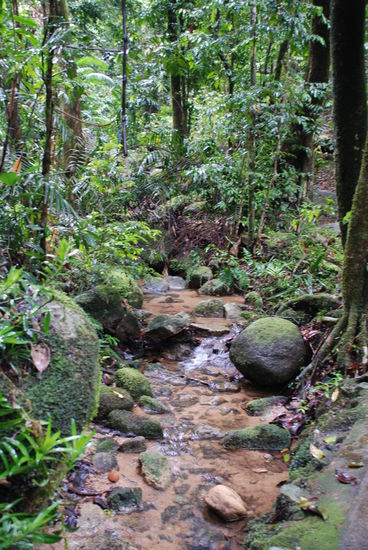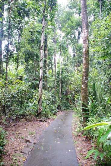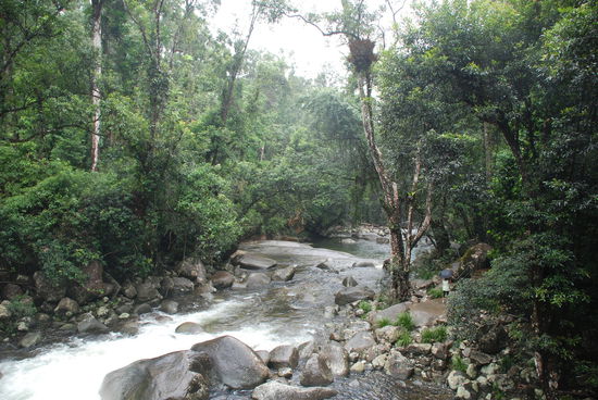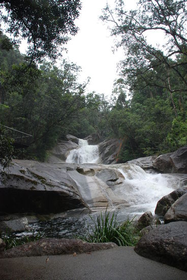 Leider ist es den ganzen Tag schon etwas nieslig, aber davon lassen wir uns nicht die Laune verderben Und wir haben Glück, die meiste Zeit marschieren wir ohne Regen. Die Landschaft ist wieder grandios, und die Fälle selbst wunderschön. Nach der ca. 1,5 Stunden Wanderung wollen wir noch den Jungle Circuit gehen, der auf dem Infoblatt noch eingezeichnet war. Doch vergeblich suchen wir die Brücke, nach der es losgehen sollte - es gibt keine!! Da wir keine Lust verspüren durch den kalten Fluss zu schwimmen, lassen wir es und fahren zurück nach Cairns. Im Tourist-Office fragen wir nach, wo denn genau die Brücke hätte sein sollen, und bekommen nur die lässige Antwort: "Ach, die hat es vor ein paar Monaten schon durch schwere Regenfälle weggerissen." Aha Da sieht man wieder, die Aussis nehmen alles viel lockerer als wir. Wahrscheinlich sind sie deshalb so fröhlich und superfreundlich.