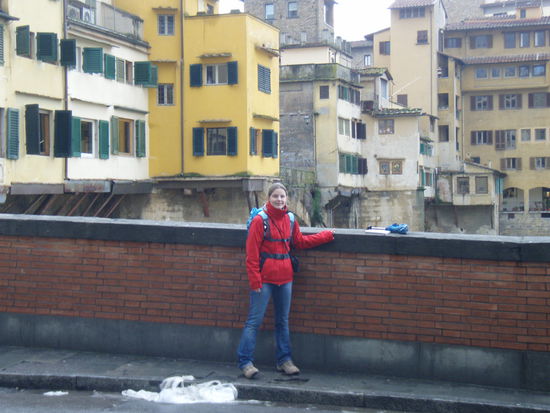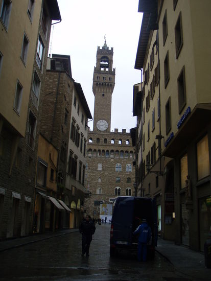 Langsam kauen, noch ein Mineral bitte, noch einmal auf die Toilette... Aber es hat noch immer nicht aufgehört, und wer weiß, ob es das überhaupt heute noch tut. Na gut, wir wollen nicht den ganzen Tag in Florenz im Restaurant vebringen (die Kellnerin hat uns eh schon ins Visier genommen und wirft uns vorwurfsvolle Blicke zu, neue Gäste suchen schon Platz im Lokal). Also Kapuze rauf und hinaus in das Mistwetter. Natürlich laufen wir wieder einmal in die falsche Richtung, nach einer halben Stunde kennen wir uns nicht mehr aus (In unserem Reiseführer ist nur ungefähr jede 3. Strasse eingezeichnet...)nund gehen zurück. Gerade als wir endlich den Ausgangspunkt für unseren Rundgang erreicht haben, hört es auf zu regnen!