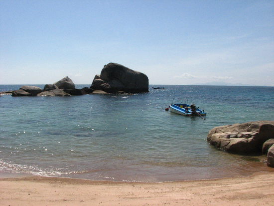 Wir beschließen auf die andere Seite der Insel zu fahren. Mal sehen, wie es da so ausschaut. Bingo! Wir finden ein kleines Paradies vor. Kleine Bucht, mit Hütten direkt am Strand. Ein Korallenriff inklusive. Umgeben ist die Bucht von bewachsenen Felsen. Palmen ohne Ende. Besser geht's nicht.