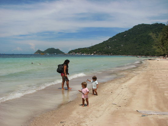 Nach dem Chaos in Bangkok und der stressigen Nachtfahrt bis Ko Tao, sind wir bereits reif für eine Insel. Ko Tao liegt im Golf von Thailand, gleich neben Ko Samui und Ko Phangan. Sie ist die kleinste dieser drei Inseln und daher entsprechend ruhiger. Im "Save"- Ressort in Mae Hat, dem Hauptort der Insel, nehmen wir uns eine einfache Hütte. Der Strand ist keine 50 Meter entfernt. Im Laufe der ersten Tage kommen wir langsam auf der Insel an. Das Wasser ist piwarm, Korallen und einige bunte Fische versüßen den Strandaufenthalt. Doch es ist Regenzeit, das heißt, es ist fast den ganzen Tag bewölkt und ab und an regnet es dann auch ganz ordentlich. Mit anderen Worten: Wir haben hier richtig schlechtes Wetter! Trotzdem laufen wir mit T-Shits herum und ölen den ganzen Tag, weil es so schwül ist. Auch vom Baden kann uns der Regen nicht abhalten. Die Kinder scheinen es hier auf alle Fälle ganz prima zu finden.