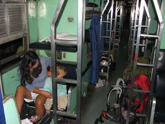 Als wir den Zug bestiegen, stellte sich die Situation allerdings wieder ganz anders dar. Es gab massig Lower Beds. Der Schaffner verlangte einen Aufschlag von 100 Bath (zwei Euro) und unsere Nerven waren gerettet. Lia ging es derweil auch schon wieder etwas besser. Sie trank plötzlich wieder mehr und schien im Lokal in Champhon eine "Hallo-bin-wieder-wach-Tablette" genommen zu haben. Im Zug selber schliefen die Kinder sofort ein. Die Fahrt mit dem Zug war schon ein kleines Abenteuer. Kindersicher war der Zug auf alle Fälle nicht, geschweige denn, dass die Türen des Zuges geschlossen werden. Egal, dadurch war die Belüftung besser. Auch wenn der Zug mehr als das doppelte des Busses kostete, lohnte sich die Fahrt, denn im Liegewagen fährt es sich auch oder grade mit Kindern viel bequemer.