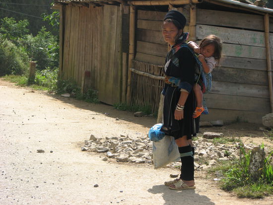Eine der H´mongfrauen meint, dass die Kinder in unseren selber genähten Tragetüchern nicht gut sitzen würden. Sie zeigte uns dann, wie man die Tücher richtig bindet, wodurch es sowohl für die Kinder als auch für uns merklich bequemer wurde. Außerdem habe sie in ihrem Dorf schöne Tragetücher, welche wir auch kaufen könnten. (Anmerkung des Nähers: Technisch waren die Tragetücher bestens entwickelt und genäht worden) Da nun unsere -zwar selber entworfenen und selbst genähten - Tragetücher pottenhäßlich waren und die uns angebotenen Tücher ein hübsches und praktisches Mitbringsel darstellen würden, entschlossen wir uns, diese zu erwerben. Während nun also die uns zugehörige Tourgruppe ungebeten warten musste, verhandelten Lili und Marco im Schnellverfahren über den Preis für zwei hübsche Tragetücher der H´mong. Anfangspreis: 560000 Dong (22,40 Euro). Bei 300000 Dong war man sich schell einig und die Tourgruppe trotzdem ungeduldig. Ok, Das anschließende Fotoshooting unsererseits war vielleicht zu viel des guten.