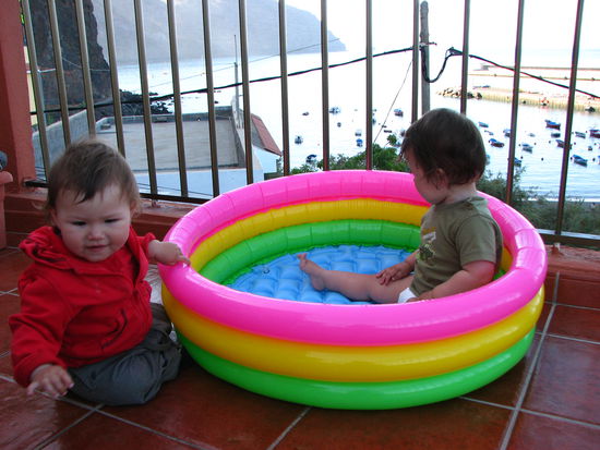 Einheftiger Streit ist entbrannt: Lili meint, sie müsse im Supermarkt auch noch ein Babyplantschbecken kaufen. Marco sagt, 8 Euro sei viel zu teuer für die Kinder. Deshalb müsse nun der für morgen geplant Ausflug nach San Sebastian ausfallen, weil nun diese 8 Euro fehlen und wir jetzt kein Geld mehr für Benzin haben. Lili meinte zwar, die Kinder würden sich darüber freuen, dies konnte Marco aber gleich widerlegen, indem er den Kindern das Plantschbecken (noch in der Schachtel verpackt) in die Hände drückte. Yara interessierte sich gar nicht dafür und Lia schmiss die schwere Schachtel gleich wieder auf den Boden. Ich muss nun folgendes dazu sagen: Ich finde, ein gutes hat so ein Babyplantschbecken. Denn nun müssen wir überhaupt nicht mehr an diesen schwarzen Sandstrand gehen, sondern können fortan auf unserer Sonnenterrasse bleiben - eine große Arbeitserleichterung!