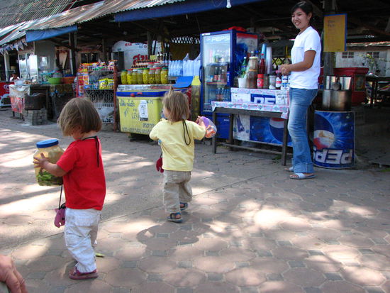Zum Frühstück starteten wir in der Frühe zum Mekong. Das Lokal lag direkt am Mekong und gab uns einen prächtigen Blick auf den Fluss und die Landschaft und auf das gegenüberliegende Laos - kaum einen Kilometer weit entfernt. "Fried chicken with basil on rice" (schön scharf), "Chickensoup" (nicht ganz so scharf) und "plain rice" für die Kinder - mit solch einem Frühstück lässt sich der Tag gut angehen. Heute ist hier ein großer Markt, es erscheint fast wie ein Flohmarkt, da es viele fehlerhafte oder gebrauchte Ware zu kaufen gibt. Da wir für die Berge in Laos warme "Einwegklamotten" benötigen, kommt uns dieser Markt grade recht. Wir erstehen Pullover für die Kinder und Marco und eine neue Hose für Marco. Seine alte Hose macht es nämlich nicht mehr lange. Wir bezahlen für alles 235 Baht, umgerechnet 4,70 Euro. Just im Anschluss wurden die Kinder auch schon müde, Zeit für ein ausgiebiges Mittagsschläfchen. Zum Abend in ein anderes Lokal am Fluss geschlendert, die Kleinen durften noch eine Weile auf dem "Kinderspielplatz" spielen, an dessen Rand mit Blick auf den Mekong sich sportbegeisterte Eltern an Fitnessgeräten austoben konnten. Aktives Nichtstun ist aber auch sehr angenehm.