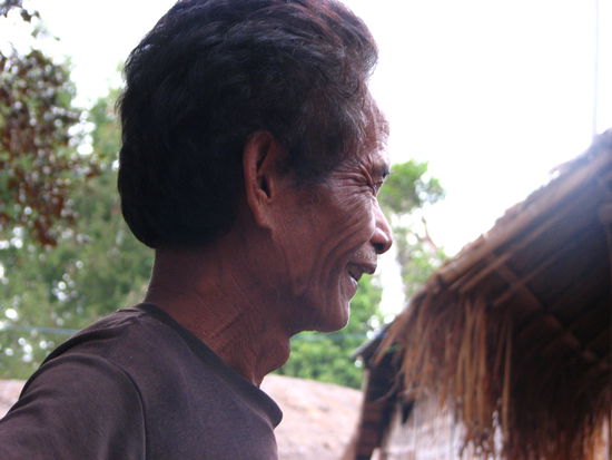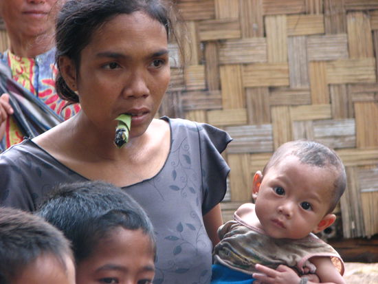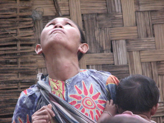 Nach ca. 20 Minuten erreichten wir ein Dorf. Alle Stelzenhäuser stehen hier in Kreisform. Ein älterer Herr mit Zigarre im Mund und viele Kinder umringen uns. Später gesellen sich noch einige Frauen mit fettem qualmenden Joint im Mund zu uns. Eine hält ein kleines Baby auf dem Arm. Welches Kraut die Leute hier rauchen wissen wir nicht. Nach einem kurzem Smalltalk gehen wir wieder Richtung Fluss zurück. Eine kleine Kinderhorde begleitet uns. Alle wollen einen "Pen" haben. Wir verteilen stattdessen eine kleine Süßigkeit, die wir uns alle teilen. Plötzlich fängt es an zu regnen. Erst leicht, dann ziemlich stark. Wir binden uns Lia und Yara wieder im Tragetuch auf den Rücken und laufen zurück zum Guesthouse. So klatschnass wie an diesem Tag war unsere Kleidung schon lange nicht mehr.