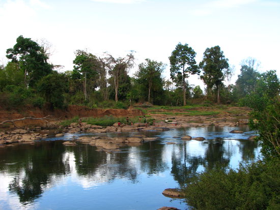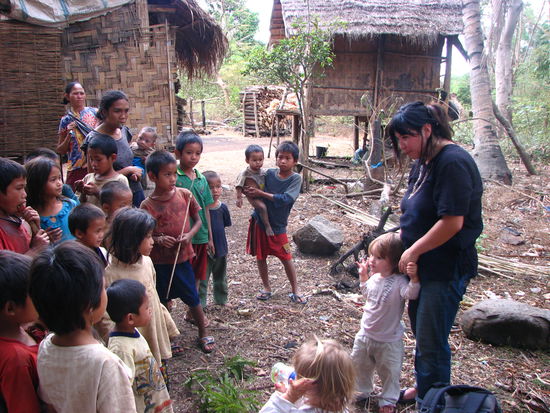 Nach zwei Stunden Fahrt, vorbei an wunderschöner Landschaft, zahlreichen Stelzenhäusern aus Holz, kamen wir in Tad Lo an. Dort teilten wir uns mit drei weiteren Touristen das Tuk Tuk und fuhren bis zum Fluss, wo sich die meisten Unterkünfte befinden. Wir suchten uns ein Guesthouse mit Blick auf den Wasserfall und Fluss aus. Ländliche Idylle pur. Morgens baden schon baden viele Kinder im Fluss, die Frauen waschen hier ihre Wäsche oder fangen Fische. Mittags besuchte Lili das nahegelegene Dorf. Hier erscheint alles wie in einer anderen Welt. Zwischen einfachen Stelzenhäuser findet hier das pralle Leben statt. Unzählige Kinder spielen zwischen den Häusern und am Fluss. Kühe, Schweine, Hühner, Enten und Hunde laufen frei herum. Auch ein kleines Wat steht inmitten des Dorfes. Nachmittags gemeinsam mit den Kindern in das Dorf gelaufen. Lia und Yara hatten einen Heidenspaß. Mehrere Kinder spielten mit ihnen bzw. helfen den beiden auf dem Weg.