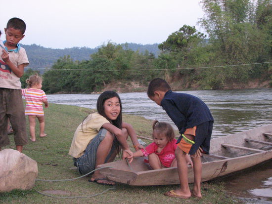 Kurz nach dem Aufwachen ist Marco schon auf der Suche nach einem geeigneten Motorbike. Leider findet er kein Preisgünstiges. Daher entschließt er sich ein Motorbike der Travel Lodge für 100.000 Kip zu mieten. Mit diesem fahren wir aus Thakek raus in Richtung Mahaxai. Der Weg ist unbeschreiblich. Über eine Betonpiste geht es hinab in Richtung Berge. Die Landschaft ist grün. Vor uns liegen einzelne hohen Berge. Recht und links zweigt sich der Weg ab. Einer führt in Richtung Buddha Cave. Wir entschließen uns die Höhle Xiang Liab an zuschauen. Vor dieser Höhle befindet sich ein kleiner Laden. Hier machen wir Halt, um eine Cola zu trinken. Ein nette Familie mit drei Kindern lebt hier. Plötzlich stellt Lili fest, dass sie ihren Rucksack nicht dabei hat. Sie hat ihn beim letzten Einkauf heute morgen in Thakek vergessen. Der Schock ist groß. Denn bis auf Kinderersatzkleidung, Windeln und Spielzeug, befindet sich darin auch ihre Sonnenbrille und Kamera. Das Geld zum Glück nicht. Marco und Lili hoffen, dass sie diesen Rucksack nun wiederbekommen. Marco fährt die 11 km nach Thakek alleine mit dem Motorbike zurück, um den Laden ausfindig zu machen, wo Lili meint, ihren Rucksack liegengelassen zu haben. Lili bleibt derweil mit Lia und Yara bei dem Laden und freundet sich mit der Familie an. Nach etwa einer halben Stunde kommt Marco wieder. Die Freude ist groß, denn der Rucksack samt Inhalt ist wieder da! Nun können wir endlich die Höhle besichtigen. Fünf Kinder führen uns zur Höhle und werden zu erstklassigen Helfern. Der Weg ist nicht einfach. Wir müssen über Steine und Geröll klettern. Die Kinder kennen die besten Wege und tragen ab und zu Lia und Yara. Wir haben alle einen Heidenspaß. Yara juchzt die ganze Zeit, und Lia möchte mal wieder lieber bei einem der Kinder auf dem Arm sein und nicht bei ihrer MamaJ!