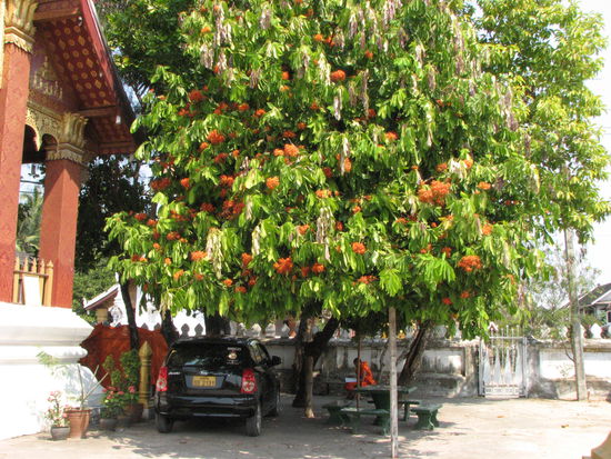 Mit dem Minibus ging die Fahrt weiter nach Luang Prabang. Das Hotel, welches uns in Luang Prabang empfohlen wurde war leider viel teurer als erwartet und somit mussten wir erst eine entsprechende Bleibe finden. Überhaupt empfinden wir Luang Prabang als unverschämt teuer (Für eine 5 qm-Butze verlangt man hier 70000 Kip = 6 Euro) In der Stadt, welche zum Weltkulturerbe gehört, sind Unmengen an Touristen. Dies ist für uns eine ungewohnte Situation, da wir grade aus Laos Norden kommen, welcher sehr viel unberührter ist.