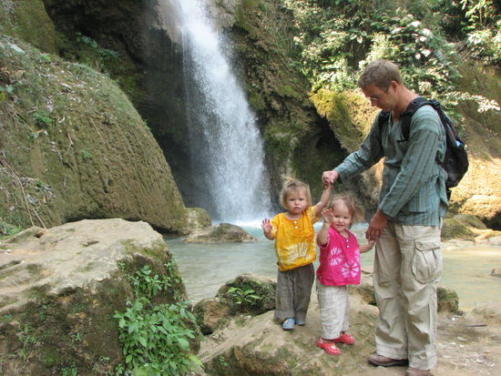 In Luang Prabang haben wir die Altstadt besichtigt. Abends auf dem Nachtmarkt gewesen, welcher schön zum Shoppen einlädt, aber doch recht teuer ist - Handeln ist also angesagt. Als wir zu unserem Guesthouse zurück kamen, gab es auf der Straße ein kleines Fest. Eine laotische Band spielte und es schien so, dass wer singen wollte, dies auch tun konnte. Es wurde ausgiebig getanzt und da Yara und Lia jede Art von Musik lieben, fanden wir sie auf den verschiedenen Armen der tanzenden Laoten wieder. Yaras Lieblingswort, wenn sie etwas noch einmal möchte, ist: "mehr". Bei ihr klingt das dann wie ein sich überschlagend gepiepstes "mea, mea". Und schwupp - war sie wieder auf einem Arm auf der Tanzfläche.