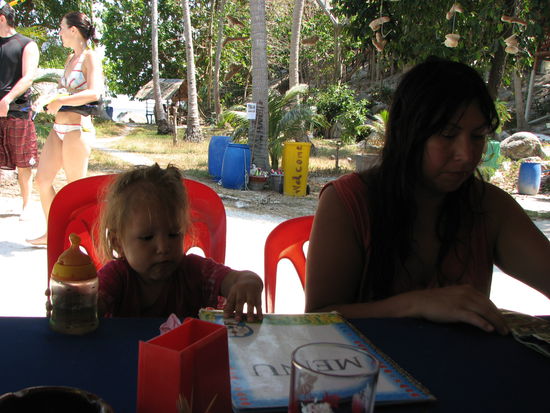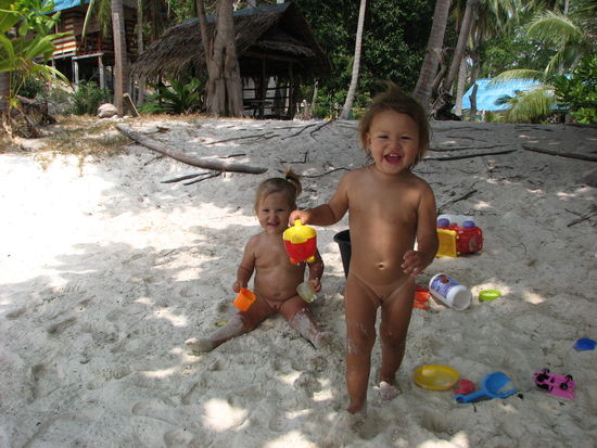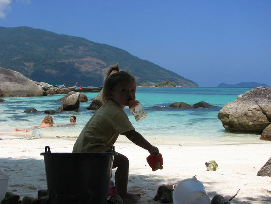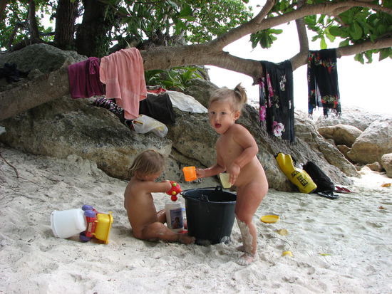 Ab uns zu Schnorcheln (Marco ist hier auf Haisuche und hat auch einen gesehen) und Baden wir im Wechsel, während Lia und Yara sich mit einem Eimer Wasser und viel Spielzeug zufrieden geben. Es ist an einigen Tagen sogar möglich etwas zu lesen. Nur wenige Meter entfernt befindet sich ein kleines Lokal. Hier lassen wir es uns schmecken und Lia und Yara dürfen hier auch in der Babyschaukel in den Mittagsschlaf gewogen werden.
