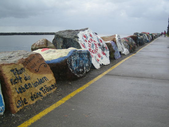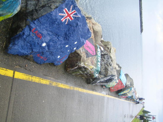 Danach ging es zur Sundowner-Breakwall, einer Steinwand direkt am Meer, an der man sich verewigen kann. Wer noch eine Geschaeftsidee sucht: hier Farbe zu verkaufen waere der Renner, denn die haben wir weit und breit nicht gefunden, so dass keine Gruesse meinerseits festgehalten sind. Da das Wetter aber auch zusehends schlechter wurde, muss ich zugeben auch nicht sehr doll gesucht zu haben.