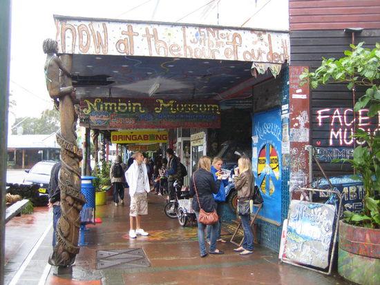 Da Timo, ein Freund von Merret am naechsten Tag einen Busausflug nach Nimbin gebucht hatte, haben wir uns kurzerhand entschieden, dem Reisebus zu folgen und einen kleinen Stopp in der Hippiestadt einzulegen. Gesagt, getan. Dumemrweise war unser Hostel das 1. in dem die Teilnehmer der Reisegruppe eingesammelt wurden, so dass wir noch 30 Minuten und diverse Hostels spaeter hinter dem Reisebus hertuckerten. Wir haben uns schon etwas geniert, da die ganze Sache etwas peinlich anmutete. Wirklich blamabel wurde es aber erst, als der Reisebus auf der Hoehe unseres Autos anhielt und der Busfahrer (vor derweil komplett gefuelltem Bus) die Tueren oeffnete und uns fragte, was wir wollen... Als Master der Scheiben habe ich einfach versucht, mich vor der Antwort zu retten, indem ich Merrets Scheibe herunterliess, aber das hat natuerlich nur darin gegipfelt, dass warhscheinlich der ganze Bus sich seinen Teil zu "Blondine am Steuer" dachte.