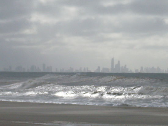 ging es nach Surfers Paradise. Nachdem wir dort in unser 8Bettzimmer, das wir ganz fuer uns hatten, eingecheckt hatten, ging es zum Strand. Nach den ganzen Schaeden, die der Sturm angerichtet hatte und die wir ueber die Fahrt hinweg bestaunen konnten, die Nachrichten, die informierten, dass es sogar Tote gegeben hat, Teile von Queensland evakuiert sind und einige noch immer ohne Strom, war es wenig verwunderlich, dass der Strand nicht aussah, wie ein Strand an einem schoenen Sonnentag aussieht. Aber was hier geschehen war, liess uns voellig fasziniert einige Minuten mit Staunen beobachten...