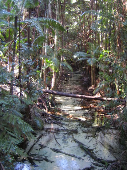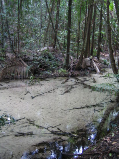 Dann ging es durch den Regenwald. Auch hier ein unglaublicher Anblick: ein kleiner Fluss, der sich durch den Regenwald schlaengelt und dessen Grund aus feinem Strandsand besteht...