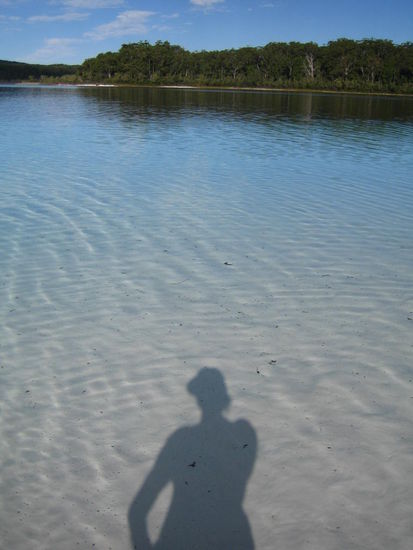 Zwar liegen da ein paar abgestorbene Palmenblaetter drin, aber dafuer ist es eben von Menschenhand unberuehrter Regenwald. Das Wasser ist einige hundert Jahre alt, bis es hier entlang fliesst und man kann es angeblich auch trinken, was ich - lieder- nicht probiert habe. Nach einer kurzen Fruehstueckspause (Ash, der Gute hat gekocht ging es weiter zum klassischen Ausflugsziel: Lake McKenzie