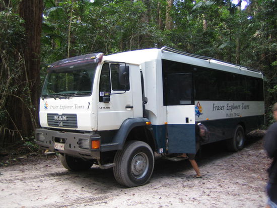 Nachdem wir am fruehen Morgen mit der Faehre uebergesetzt hatten, wurden wir von unserem Guide - Ash (ja, wie die Asche) - abgeholt und mit dem Vierradantrieblaster ueber die Insel kutschiert. Erstmal ging es ueber einen Streckenabschnitt, der nicht ohne Grund "rollercoaster" heisst, zu unserem ersten Ziel