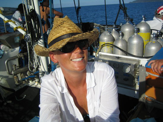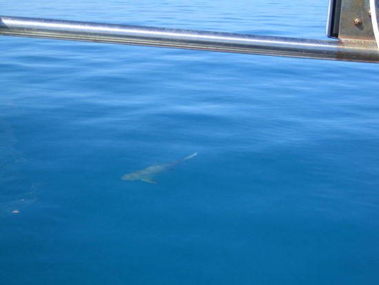 Dann ging es ans Eingemachte: noch einmal tief Luft holen und von der Plattform direkt ins Wasser gesprungen. An der Seite des Bootes war eine Metallstange befestigt, an der wir uns festhalten und die Atmung ueben konnten. Hier fing das mulmige Gefuehl im Magen langsam an. Atmen sollte ja eigentlich kein Problem sein... Alles andere aber. Ich hatte die ganze Sache voellig unterschaetzt. WArum hatte mir keiner gesagt, wie laut ich mich selbst atmen hoere? Und warumm hatte mir keiner gesagt, dass beim Ausatmen ueberall diese Blasen aufsteigen???