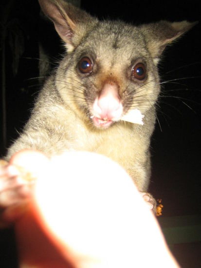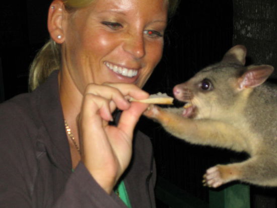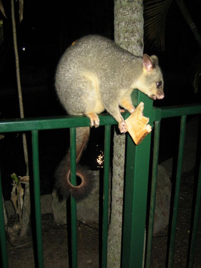 Und weil ich natuerlich nicht nur so eine tolle Mitarbeiterin, sondern auch so eine gute Konkurrentin bin, hat mich ein Mitarbeiter (Busfahrer) eines anderen Hostels abends eingeladen, mal auf ein free meal vorbeizuschauen. Nicht selbst kochen? Da bin ich doch dabei. Und neben dem Essen, gab es auch noch Streichelzoo umsonst. Das erste Mal, dass ich ein Opossum (hier heissen die nur Possum) in freier Wildbahn sehe...