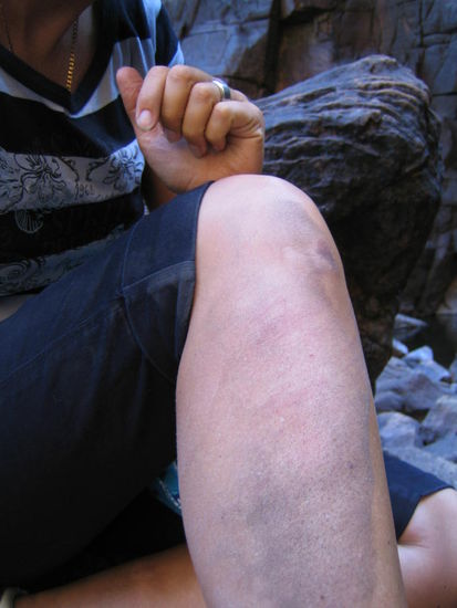 Muss man sich mal ueberlegen, was eure rasende Reporterin so alles auf sich nimmt, um fuer Euch from the middle of nowhere berichten zu koennen... Ich war natuerlich die Doofe, die sich zwischen den Steinen erstmal hingelegt hat. Und NEIN, das lag nicht daran, dass ich keine Wanderschuhe hatte. Meine Turnschuhe haben mir ganz hervorragende Dienste geleistet, obwohl das Profil so langsam ein wenig abgelaufen ist.