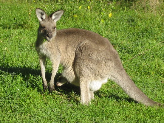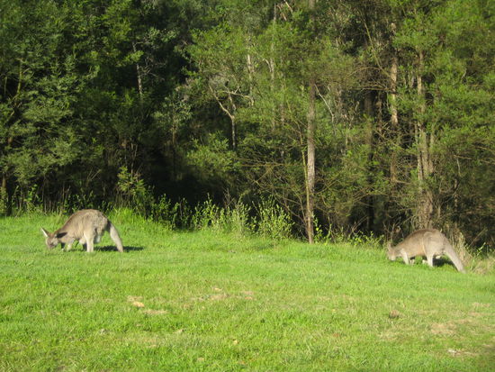 Am Samstag sind wir nach knapp 2stuendiger Busfahrt endlich angekommen: mein erster Besuch eines Nationalparkes. Der Nebel stand noch am Boden, es war ziemlich frostig, aber genau die richtige Zeit, um auf Kaengurus beim Fruehstueck zu hoffen... Und: ja, das Warten (und Waten durch taudurchnaesstes Gras, nasse Fuesse etc) hat sich gelohnt: das Nationaltier beimk Fruehstueck - sogar mit Nachwuchs. Unglaublich, haben sich von unserer Truppe (immerhin knapp 30 Leute) gar nicht stoeren lassen und wir kamen bis auf 5 Meter an sie dran.