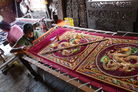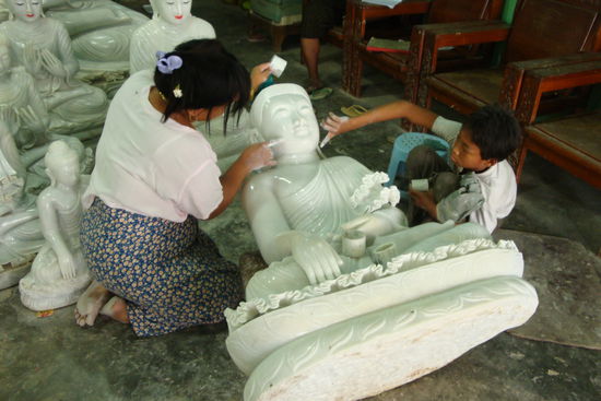 Zurück zur Story: Wir haben dann kurz relaxt und haben uns dann ein Taxi für einen Tag Mandalay organisieren lassen. Das Hotel soll wenigstens noch ein bisschen etwas an uns verdienen! Wir wollten nämlich unbedingt Handwerkstätten sehen, und da diese ziemlich versteckt liegen sollen, haben wir uns entschieden, doch gleich ein Taxi dafür zu nehmen, das sich vor Ort auskennt und uns an die besten Plätze bringt. Außerdem konnten wir so auch noch gleich die Pagoden und Klöster mit ins Programm nehmen. So haben wir auch Win San kennengelernt, einen sehr netten jungen Burmesen, der eines dieser genialen blauen Mini-Pickup-Taxis besitzt. Er wurde unser Driver für die nächsten 2 Tage. Der hat uns dann quer durch Mandalay kutschiert und uns sehr viele Werkstätten gezeigt: Goldplättchen-Herstellung, Bambus-Schirme-Shop, Steinmetz (Buddha-Figuren), Holzschnitzer, Marionetten-, Tuch-, Polsterbezug-Herstellung etc. etc. Am besten fand ich die Straße voll mit Steinmetzen, zwar total staubig, aber sehr interessant: Der Buddha wie er im Tempel dann steht in allen seinen Stadien der Entstehung.