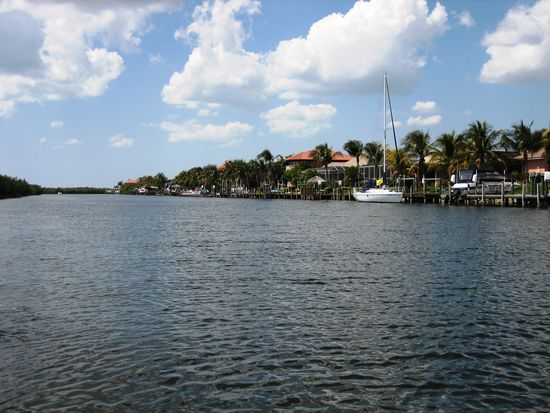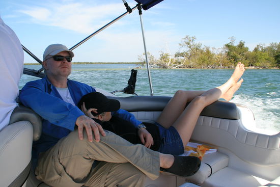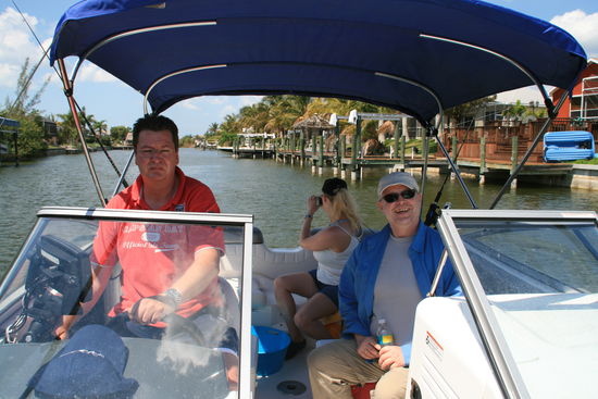 Dann geht es endlich los! Ca. 1,5 Stunden brauchen wir durch das Kanalsystem und die Schleuse bis zum Runrunners - dem Ein-/Ausgang zum Golf - dann sind wir endlich auf dem Meer. Dort sind wir etwas verloren, weil die vom Verleiher zur Verfügung gestellten Karten sehr schlecht und leihenhaft sind. So kurven wir nur etwas herum, geben ein paar mal ordentlich Gas, um dann den Anker zu werfen und kurze zu angeln. Ich lese derweil.... Als Toilette benutzen wir für Sophia unter lautem Gelächter eine blaue Plastikschüssel....