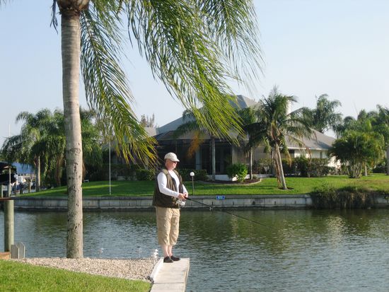 Dort sitzen wir am Pool zusammen und siedeln dann schließlich zur Sitzgruppe am Kanal um, um die Angeln aufzubauen.