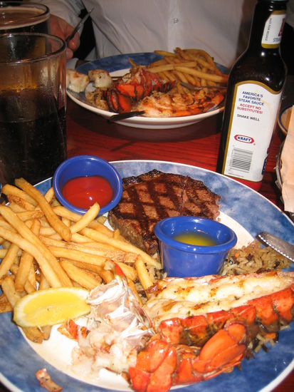 Um 18.00 Uhr gehen wir zum Red Lobster und essen und genießen Hummerschwänze, Steak, Garnelen und Scalopps. Zum Nachtisch gibt es noch meinen geliebten Apfelkuchen mit Vanilleeis. Lecker!