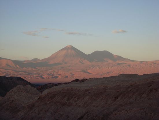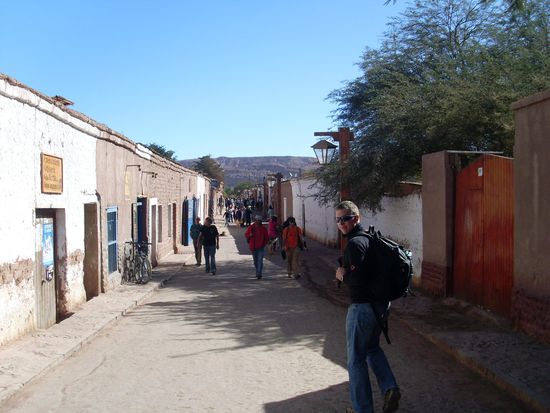 San Pedro liegt auf 2600 m am Rande der Atacama-Wueste, einer bizarren Stein- und Felswueste mit ein paar Sandduenen, die die ganz Verrueckten mit einer Art Snowboard runterfahren. Ueber allem thront ein maechtiger Vulkan, der Licanbur (den man natuerlich auch hochklattern kann), 3000 Einwohner und in der Hochsaison 5 mal so viele Touris!